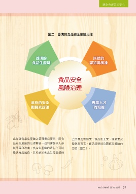 讓飲食暖胃又安心 圖二 臺灣的食品安全風險治理 透明的 民眾的 食品生產鏈 認知與溝通 食品安全 風險治理 政府的安全 專業人才 把關及認證 的培養 此加強食品生產鏈之管理是必要的,而食 上的農產製造業、食品加工業、運銷業及 品安全風險的治理需要一切利害關係人參 餐飲業而言,資訊透明與公開都是避險的 與學習和改善。食品生產鏈的透明化可以 基礎(圖二)。 降低食品風險,對於處於食品生產鏈環節 No.14 MAR. 2018. MJIB 37